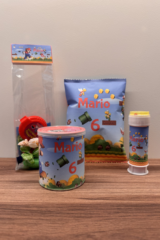 Maak jouw traktatie uniek met eigen naam en leeftijd in dit leuke Mario thema.